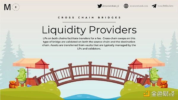 两个链上都创建了资金池,并为转账提供便利,收取一定费用。这个系统在充分去中心化,有效地再平衡,并且 LP 有足够的激励措施来保持桥两侧的充足流动性时,该系统运行良好。这种类型的桥上的跨链交易在源链和目标链上都有效的。资产从通常由 LP 和验证者管理的金库中转移。