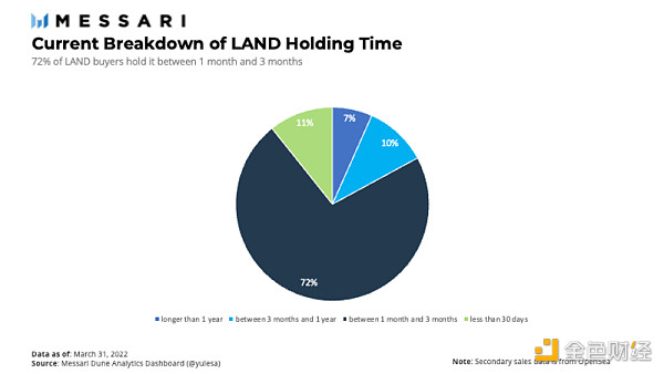 为了了解 LAND 持有时间,可以考虑不同的购买和持有行为集群。从这个意义上说,例如,可以将长期购买行为视为持有地块超过一年,而购买和出售可以视为持有期限少于 30 天。目前对 LAND 持有时间的细分显示,7% 的购买者持有 LAND 超过一年,而 11% 的购买者持有 LAND 不到 30 天。同时,绝大多数(72%)LAND 买家持有资产的时间为 1-3 个月。