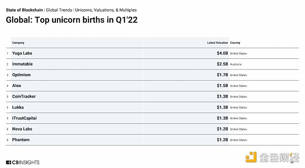 区块链独角兽公司从 49 家增加到 62 家。一季度出现的新独角兽公司包括 Yuga Labs、Immutable、Optimism、Apto 等。