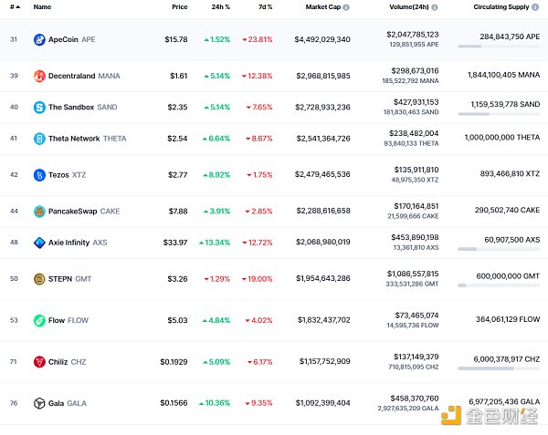 NFT总市值、市值排名前十项目 数据来源:Coinmarketcap