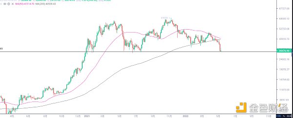 BTC3日线级别,目前可以看到50线即将死叉200线,价格最低跌至下方颈线区域,这个位置一旦有效跌破,后面下行空间将拉大,注意风险,我们可以看下之前死叉后的走势。