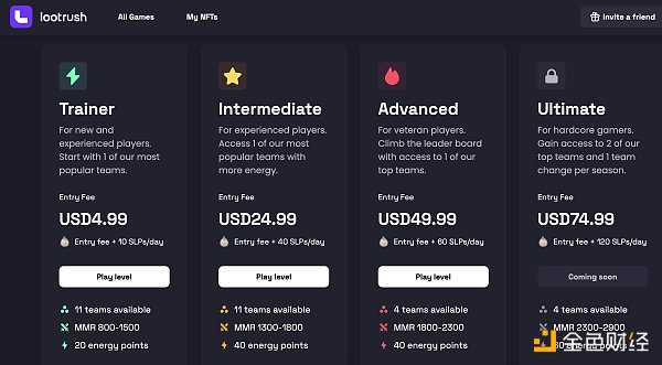 LootRush每天或每周收取固定价格,具体价格因游戏而异。对于 Axie Infinity,这范围为每天 10 到 120 个 SLP(基于Axie Infinity游戏的代币),具体取决于项目和团队。