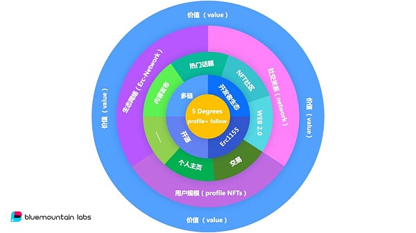 这样简单的基础协议,具备了足够的下沉能力;同时因为采用了ERC1155标准且完全开源,不仅可以无需许可植入兼容ERC1155的协议或业务;并且因为完全开源,降低了开发门槛,可以激发更多的开发者进入,一起围绕5Degrees进行技术及应用创新;再加上基于TokenPocket创建的BTC、ETH、EOS、TRX、BSC、HECO、OKT、IOST、Polkadot、Kusama等多链生态,为5Degrees快速集成各类应用带来了可行性。以上各种因素融合在一起,相互促进,形成一个以“Profile+Follow”为中心,不断往外扩张的同心圆价值圈层,共同致力于Web3生态繁荣发展。