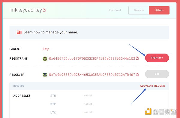 在修改名称的绑定信息(如BTC、ETH地址)时,通过发起交易改变合约中的状态,因此需要钱包发起交易并收取低gas费。
