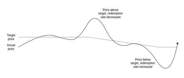 另一个需要理解的主要机制是赎回率调整。在 RAI 的例子中,目标值不是固定数量的美元,相反,它会向上或向下移动,并且向上或向下移动的速率会根据市场情况进行调整: