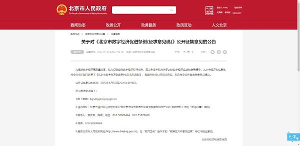 近日,《北京市数字经济促进条例(征求意见稿)》公开对外征求意见,条例将北京行之有效的政策举措上升为法规制度,通过制度创新为数字经济发展注入强劲动力,也为加快建设全球数字经济标杆城市提供法制保障。