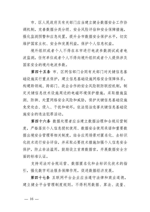 最后是数字化治理,《条例》指出,市、区城市管理部门会同有关部门应当依托物联网、区块链等技术推进城市运行“一网统管”领域相关工作,建设城市运行管理平台,开展城市运行生命体征监测,在市政管理、城市交通、生态环境、公共卫生、社会安全、应急管理等领域深化数字技术应用,实现重大突发事件的快速响应和应急联动。市、区市场监管部门会同有关部门建设一体化综合监管体系,充分利用公共数据和各领域监管系统,推行非现场执法、信用监管、风险预警等新型监管模式,提升监管水平。