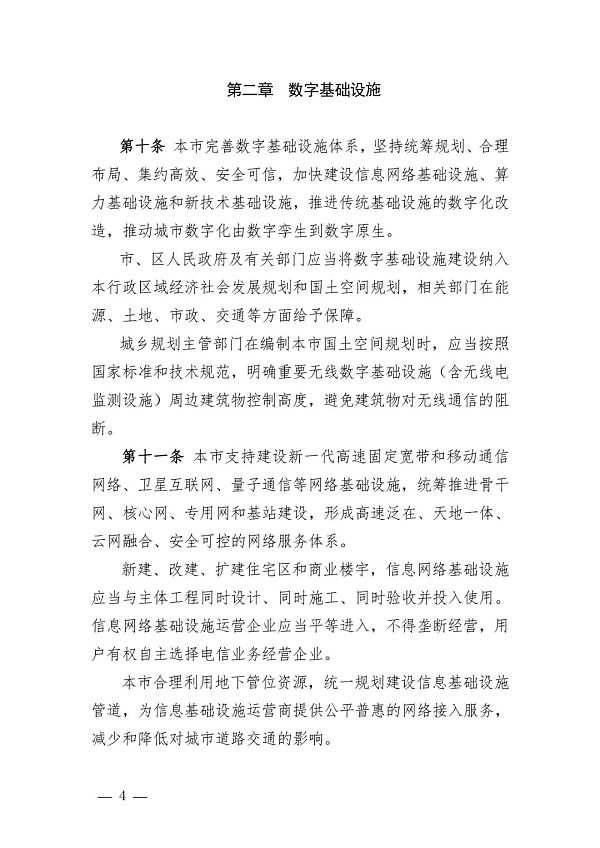 首先是数字基础设施,《条例》第十四条明确指出,本市统筹推进人工智能、区块链、大数据、隐私计算、城市空间操作系统等新技术基础设施建设,支持建设通用算法、底层技术、软硬件开源等共性平台,建立领先的新技术能力支撑体系。