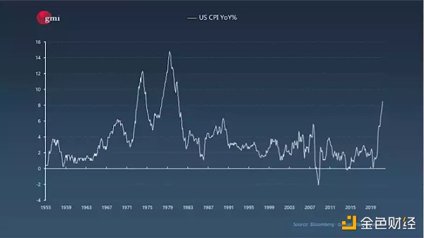 接下来,我将借助大量的信息和图表与大家分享我自己的看法。第一个问题便是通货膨胀,从下图当中我们可以看到当前的通胀率是 8%。我们很难理解为何在一个明显通货紧缩的世界中会出现这样的数字,难道是因为印钞太多了吗?