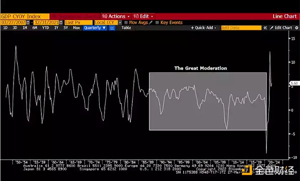 下图是美国 GDP 的图表,可以追溯到 1947 年。你可以看到在大稳健时期,GDP 的增长更加低迷。GDP 一直在持续下降,你可以看到的趋势率,自 1970 年代以来一直在下降。但我们也发现,GDP 的波动性逐渐变小。至于 2020 以后,GDP 又出现了较大波动,未来的走势我们可以拭目以待。