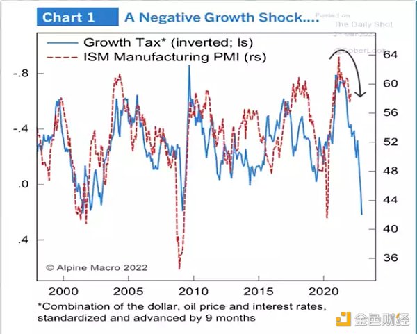 下面这张图来自 Alpine Macro,他们基于美元、石油价格以及利率水平构建了一个增长税,并将其与 ISM 进行对比。最近的情况令人担忧,ISM 指数有可能跌到 42,引发全面经济衰退。虽然数据还处在波动当中,但衰退的趋势已经开始明显,人们并没有为此做好准备。