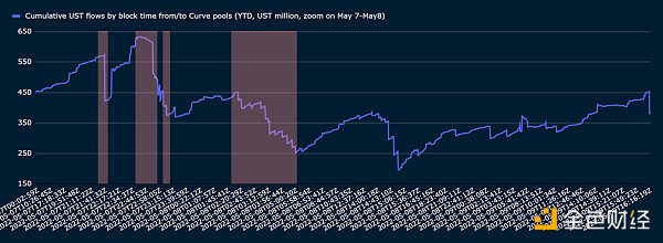 从大约 5 月 7 日 21:44 UTC到 5 月 8 日 5:35 UTC(在 Do Kwon 的推文后几个小时,见图 4),UST 流入和流出之间的战斗似乎愈演愈烈。