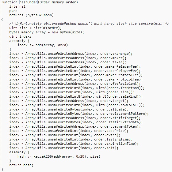 在步骤二中攻击者获取到ECDSA签名消息中的R、S、V值,即可利用其构造攻击合约盗取用户NFT。下图为OpenSea: Wyvern Exchange v1合约中验证order的函数validateOrder(),具体源码如下: