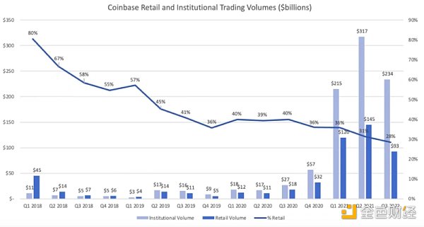 2019年第二季度,Coinbase上的机构交易量首次超过零售量。此后的每个季度,该交易所的机构交易量都超过了零售量。