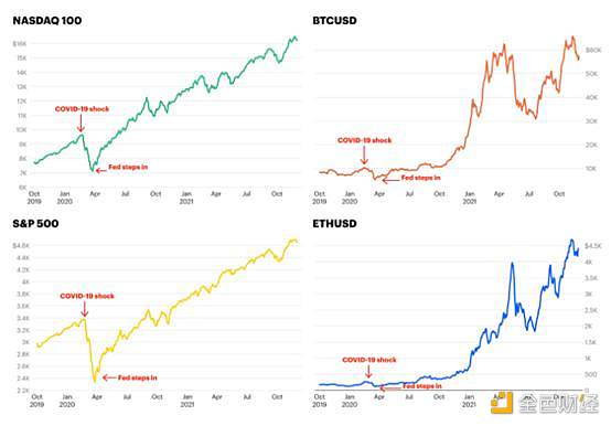 从 COVID-19 恐慌引发的底部开始,标准普尔 500 指数、纳斯达克指数、BTC 和 ETH 将分别飙升 107%、133%、1,600% 和 4,200%。