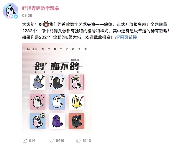 据了解,“鸽德”系列的数字藏品头像并不售卖,只需用户报名,但条件是B站用户等级达到6级,年满14周岁,且2021全年每日使用哔哩哔哩的实名制用户。另外,报名成功的用户还需要支付0.1元的费用。