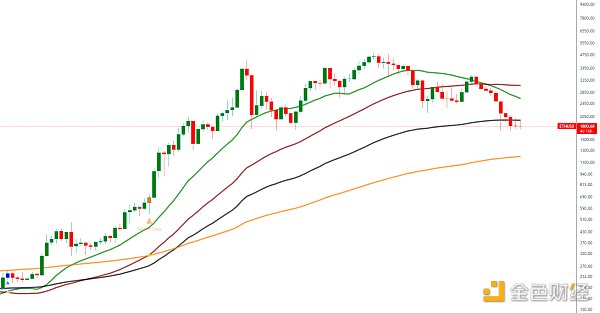 ETH自前期绿线死叉棕线后变一路下滑,如今也跌破了黑线支撑,并且这两周反弹也是触及黑线1950-2000便回落,和BTC走势进程类似,那么后面就要注意这一带跌破反抽过程完成后继续下探风险。