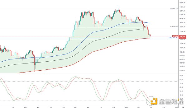 BTC依旧未破下方趋势线支撑,昨日分析已经提到过,这一带同时也是顶部1.618回撤线位置,我们看2011、2014和2018年熊底也是回撤至1.618附近见底,后面长时间震荡筑底,然后发动牛市行情,2019年小牛见顶14000回落至最低3800,也是位于这一轮1.618位置附近,目前走势较为相似,不过需要注意下方两线目前还是下滑姿态,后面将会跌至虚线下方,两线低位金叉还需要时间,我们看之前两线虚线以下金叉,后面均走出牛市行情,只是酝酿时间长短区别,短期看日线已触碰到轨道支撑线,和前期放量下砸相比,空头量能相对萎缩,指标线上行,所以有望形成双底或者底背离的机会,下方趋势线不破,激进者可以考虑逢低布局,稳健者可以等待右侧金叉机会。
