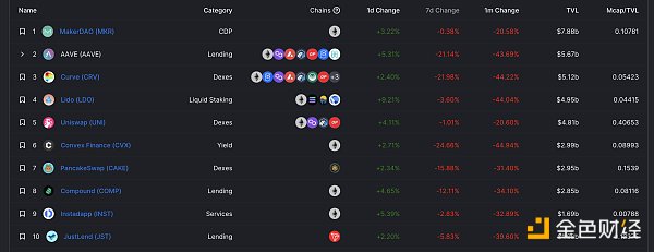 DeFi项目锁定资产前十排名及锁仓量 数据来源:defillama