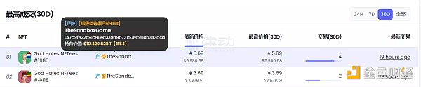 不到 2 个小时以后,Sandbox 就被宣告「拿下」。交易记录显示,The Sandbox Game 的官方钱包在 23 点 25 分左右买入了 19 个 God Hates NFTs,其中有两个分别以 5.69 ETH 和 3.69 ETH 成交,刷新了这个 NFT 系列的最高交易榜。