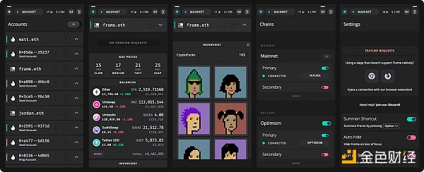 Frame 是一个桌面钱包,提供 Frame Companion?浏览器扩展。该连接器可以「将与 Frame(桌面本地以太坊钱包)的连接植入到无法直接连接 Frame 的基于浏览器的应用程序中。」