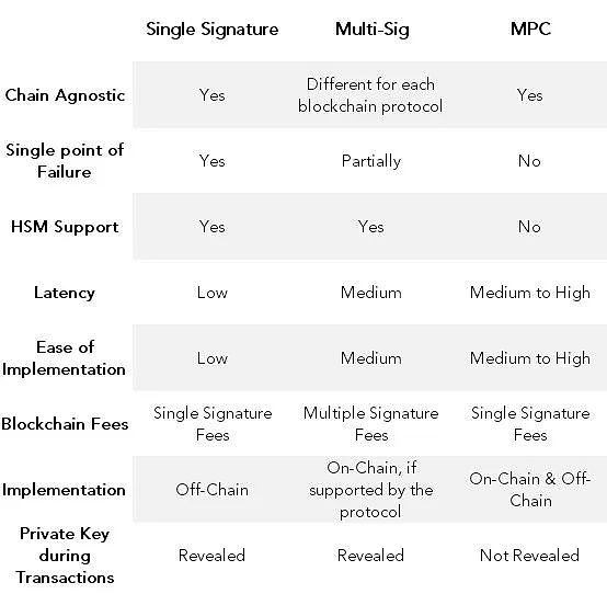 在多重签名中,每个签名者的私钥都有可能被泄露。对于MPC,私钥永远不会被创建或保存在一个地方。因此,MPC可以保护密钥不被外部或内部人员泄露。