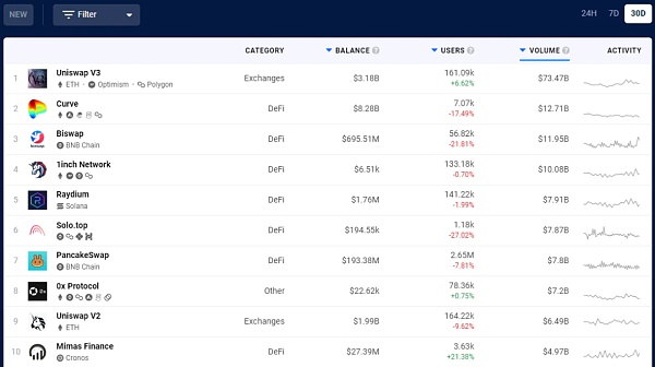 虽然dApp的价值应该在dApp的目的(例如,DeFi、GameFi、社交、元节、名称服务等)的背景下考虑,但dApp促进的价值量是惊人的。DappRadar上排名前10位的dApp在过去30天内共同促成了超过1500亿美元的转账。