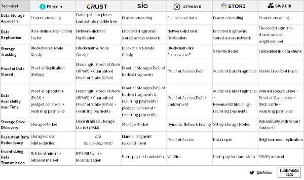 在这些网络中,有两种主要的方法用于在网络上存储数据:存储完整文件和使用纠删码:Arweave和Crust Network存储完整文件,而Filecoin、Sia、Storj和Swarm都使用纠删码。在擦除编码中,数据被分解成大小恒定的片段,每个片段都被扩展并使用冗余数据进行编码。保存到每个片段中的冗余数据使得只需要片段的一个子集来重建原始文件。