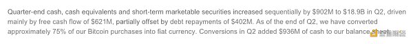 值得注意的是,二季度特斯拉已将所持大约75%的比特币兑换成法定货币,单枚比特币的出售均价约为29000美元,因此其资产负债表增加了9.36亿美元的现金。