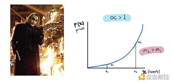 我们的杰克是第一个被描述为单调增加的人,这是一种奇怪的说法,即随着 X 增加,Y 也会增加。在我们在供应和价格之间映射的背景下,所有这些意味着你越早,造币的成本就越低。与我们的恒定曲线不同,这种正价格映射允许代币价格,而不仅仅是代币供应,来吸收需求的变化。从本质上讲,允许价格上涨并鼓励早期投资。~ 一个模仿的理由~