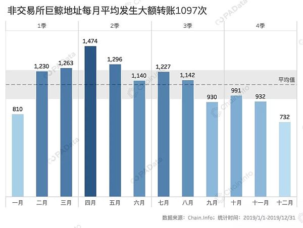 如果将余额大于2000比特币的非交易所地址定义为“巨鲸”地址的话,这些地址大约占比特币总活跃地址数的0.01%左右。根据统计,2019年非交易所“巨鲸”地址平均每月进行单笔超过50个比特币的大额转账的次数约为1097次,相当于每天有3次左右。其中第二季度是非交易所“巨鲸”大额转账最频繁的一段时间,4、5、6月共计发生3910次大额转账,4月大额转账1474次,创下全年最高。