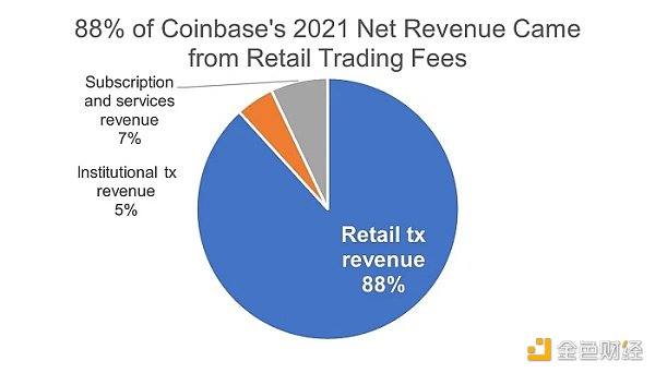 从中可见,Coinbase 将自己定位为一个专注于「实现经济自由」的 Web 3 平台,但如果我们看看当时的 Coinbase 财务状况,就会发现 Coinbase 其实应该是一家利润丰厚的加密零售经纪公司,该公司 2021 年净收入的 88% 来自零售交易费用,5% 来自机构交易收入,其余 7% 来自 「订阅和服务收入」(如下图所示)。