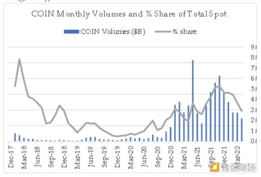 不仅如此,加密现货交易量的数据表明,Coinbase?在 2022 年的市场份额也一直在走低(如下图所示)。
