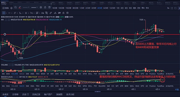 4小时线上目前整体在6600上方震荡,同时也是5/10日均线和30日均线之间运行,短期内震荡时最好的结果,可以确认30日线上来后的支撑,同时也能消耗掉macd的死叉,待运行至0轴附近还有上行的可能,届时上涨后的回调完毕、中长均线的支撑以及MACD到0轴附近再次上行,三者有形成共振的概率,这应该是本周最后一次站上7000的机会。