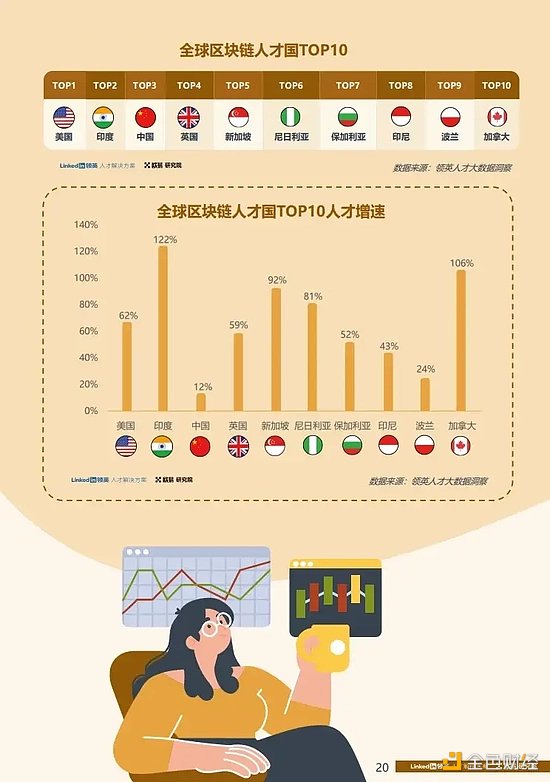 全球区块链领域人才增长强劲,但中国人才增速相对较低。全球区块链人才总量同比增长76%,美国、印度、中国为前三大区块链人才国,其中,中国人才增速相对较低,仅为12%,而中国人才需求同比增速高达60%,中国人才增速远低于人才需求增速。