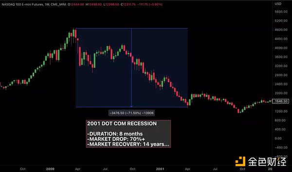 2001 年的崩盘非常严重,标准普尔 500 指数和纳斯达克指数分别花了 7 年和 14 年才能恢复。一些评论家将加密货币的高估值比作 90 年代后期的科技股。