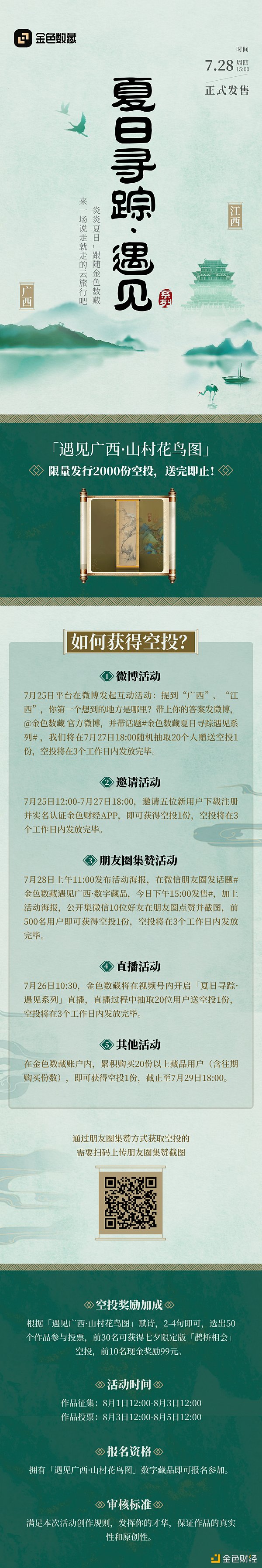 金色数藏推出与遇龙河景区旅游发展有限公司、贺州博物馆联合铸造的「夏日寻踪 · 遇见广西」主题藏品,将于7月28日15:00正式发售!