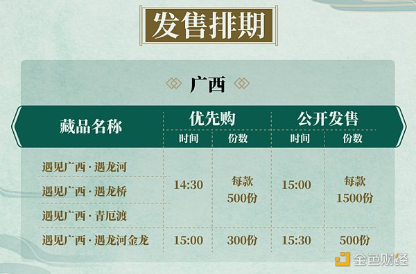 普通版+典藏版:此次「夏日寻踪 · 遇见广西」数字藏品包含4款,共发行6800份,其中1款「遇见广西 · 遇龙河金龙」为典藏版800份,剩余3款为普通版各2000份。