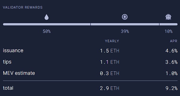 合并前后,由于ETH释放和分配情况调整,验证者将接手原矿工的部分收入,验证者的年收益率将从4.6%上升到9.2%。