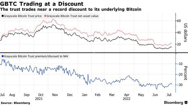 不过,该策略有一个障碍:直接从灰度购买的股票有六个月的锁仓期。从 2021 年初开始,这种限制就成了一个问题,随着GBTC 的价格从溢价滑落到折价——一股价值低于支持它的比特币——结果这款产品不得不面临来自其他同类产品更激烈的竞争。几个月过去后,GBTC 的折价幅度越来越大,所谓的 GBTC 套利交易也不再奏效——尤其是伤害了那些利用杠杆来试图提高回报的投资者——三箭资本也因此受到影响。
