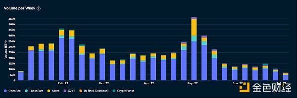 按周计算,2022 年 1 月 1 日至 6 月 30 日期间的铸造量约占 NFT 总活动量的 13.7%。与 Nansen 提供 NFT 活动覆盖的其他区块链相比,以太坊上的 NFT 铸造量所占比例较小。值得注意的是,币安智能链报告的铸造 NFT 相关量的比例最高,该区块链平均每周的铸造量占 80.2%。在 2022 年 1 月 1 日至 6 月 30 日期间,币安智能链上的 NFT 总铸造量约为 1.07 亿美元。