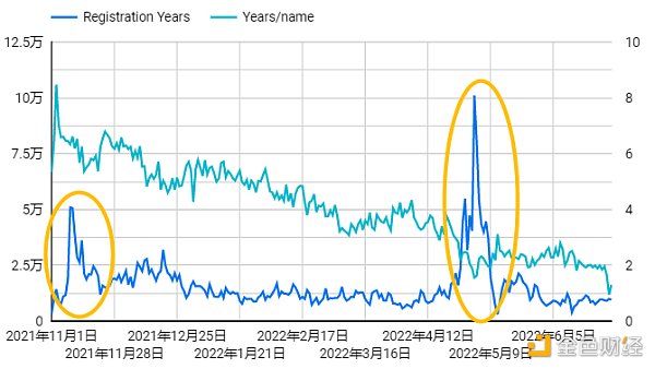 ENS 的注册量经历了两段爆发期(如上图中黄色圈中所示):