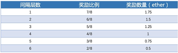 被引用的叔块获得奖励数量,取决与该叔块和引用区块的“远近”关系。关系越近,叔块得到奖励越多。而引用叔块的区块,每引用一个区块,都能得到系统出块奖励的1/32,最多只能引用两个区块。当前以太坊新区块获得系统奖励为2枚以太币(2ether),如果叔块在间隔一层就被引用,该叔块将获得出块奖励的7/8,也就是1.75ether,如果叔块隔了6层才被引用,它获得奖励只有0.5ether,具体如下表。