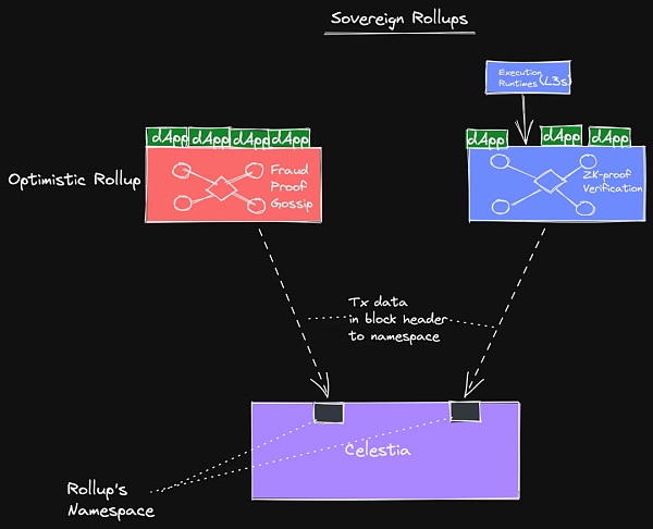 ZK rollups 依赖于有效性证明(例如 zksnarks)。作为主权 rollup 的 ZK rollup 的功能与目前的实现方式相当类似。然而,它不是向智能合约发送 ZK 证明,而是在 rollup 的点对点网络中分发,供节点验证。主权 ZK rollups 很像统一结算层上的 ZK rollups,允许各种执行运行时作为主权链在彼此之上运行,因为它们的交易不被 Celestia 解释。在这里,ZK rollup 之上的运行时可以以多种方式运行。可以有隐私保护运行时、特定于应用程序的运行时等等。这就是所谓的分形扩展(Fractal Scaling)。