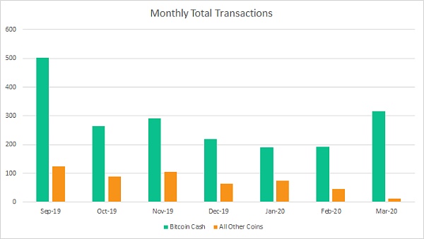 举个例子来说:在市场环境更加开放的澳大利亚,BCH的商户采纳和个人消费就在零售支付中遥遥领先。(下面我摆上两个澳大利亚零售业的加密货币使用对比图)无论是从整体消费金额,还是消费次数,BCH的表现都是遥遥领先的。