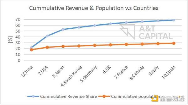 从玩家数据上看,全球玩家的地理分布几乎与人口分布相关,但我们注意到在游戏支出分布上显示了巨大的差距。三个国家(中国,美国,日本)人口总数占全球人小于四分之一,却贡献了全球游戏产业收入的 52%;而贡献了 69% 的十个国家人口总数仅为世界人口的 29%,除中国外,皆为广义的西方发达国家。