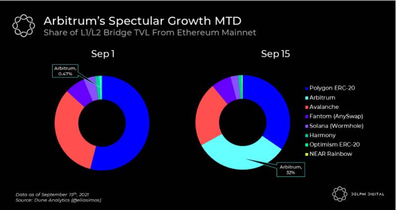 Arbitrum 的桥在 9 月 1 日仅锁定了 2200 万美元,这意味着该桥仅占以太坊桥总 TVL 的 0.047%。在过去的两周里,一些投机收益耕种和老牌协议将这一份额推高至 32%——在短短 15 天内将该桥的份额增加了 640 倍。