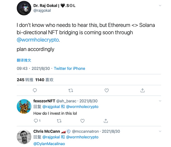 Solana 为了满足 NFT 跨链交易的需求,提供了一个相对领先的解决方案。8 月 30 日,Solana 联合创始人 Raj Gokal 发推称,Solana 跨链协议 Wormhole 计划推出以太坊和 Solana 之间的双向 NFT 桥。