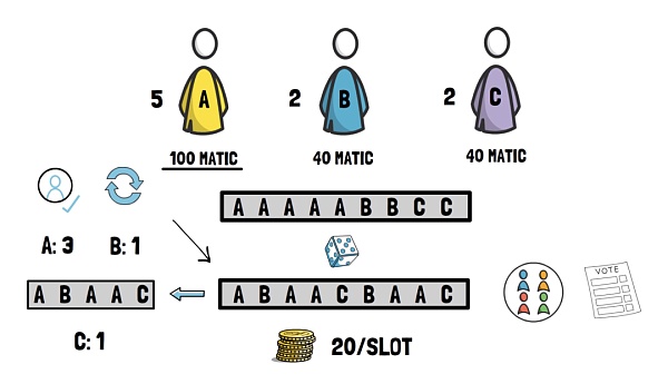 验证者根据他们的质押被分配给插槽,因为 Alice 有 100 个 MATIC 代币抵押,每个插槽有 10 个代币(由验证者管理维护),Alice 总共将获得 5 个槽位。同样,Bill 和 Clara 总共获得 2 个插槽。