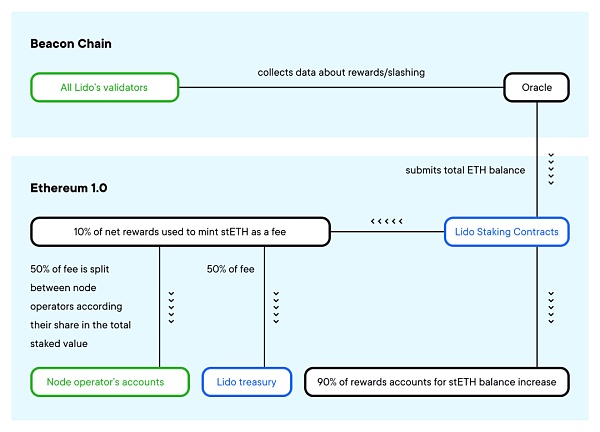 该协议使用DAO选择的预言机来监测验证者的余额,并重新确定用户的stETH余额以说明奖励。